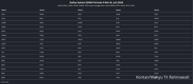 BEI merombak IDX80! BKSL, CBDK, DEWA, GGRM, TPIA resmi masuk indeks menggantikan lima saham yang didepak.