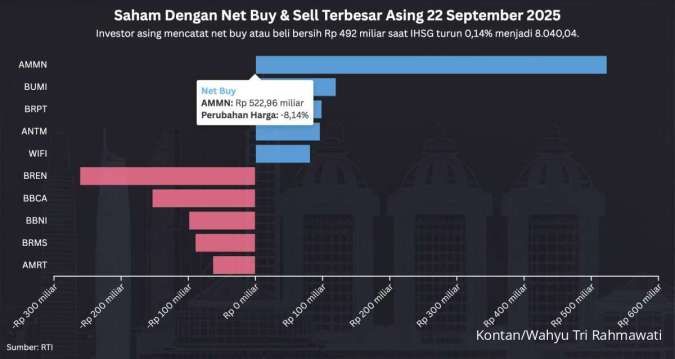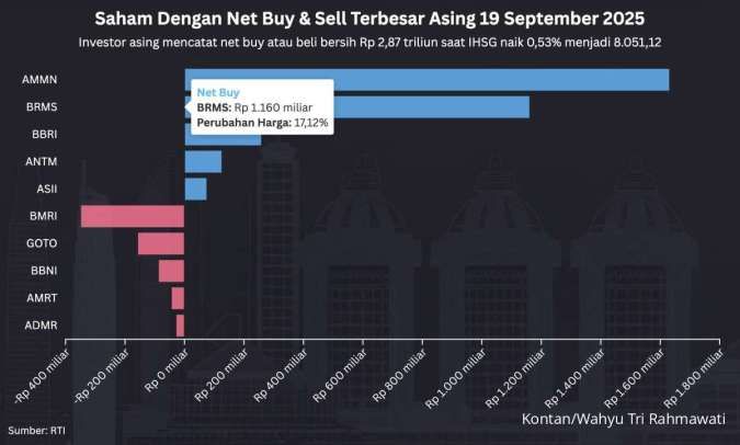 Saham-saham dengan net buy terbesar asing hari ini adalah PT Amman Mineral Internasional Tbk (AMMN) Rp 644,58 miliar, PT Bumi Resources Tbk (BUMI) Rp 106,41 miliar, dan PT Energi Mega Persada Tbk (ENRG) Rp 71,82 miliar.