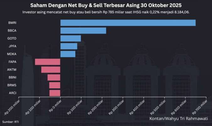 Saham-saham dengan net buy terbesar asing hari ini adalah PT Bank Rakyat Indonesia Tbk (BBRI) Rp 661,9 miliar, PT Dian Swastatika Sentosa Tbk (DSSA) Rp 265,5 miliar, dan PT Telkom Indonesia Tbk (TLKM) Rp 157,2 miliar.